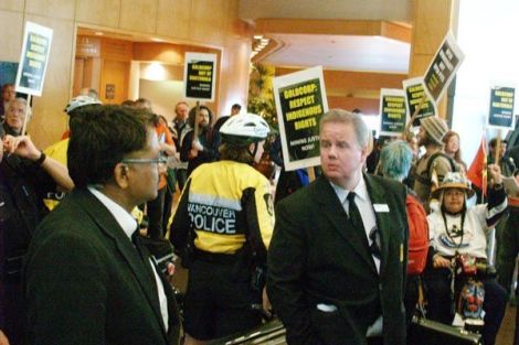Human rights lawyer Benito Morales, from the Rigoberta Menchu Tum Foundation in Guatemala, challenged Goldcorp executives inside the meeting about the Marlin mine. Photo by David P. Ball