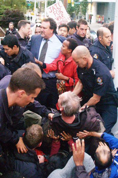 “People around the world are going to see images of the Vancouver Police Department roughing up peaceful demonstrators when they should have seen images of [police] hauling Dick Cheney off to a prison cell. It’s lucky nobody was seriously hurt,” said stopwar.ca’s Derrick O’Keefe, one of the protest organizers.