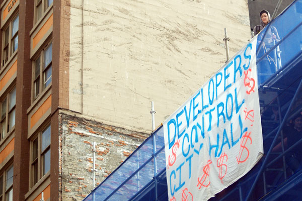 During last month’s Women’s Housing March, intrepid scaffolding-climbing enthusiasts unfurled a banner festooned with this slogan from the wreckage of the Pantages Theatre: “Developers Control City Hall.”