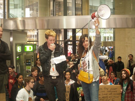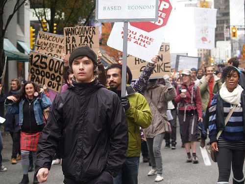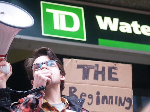 Roughly 350 demonstrators from Occupy Vancouver marched against what they say are ‘corrupt’ and ‘greedy’ Canadian financial institutions, culminating in a boisterous take-over of a Toronto Dominion (TD) branch, with dancers on teller counters and a half-hour sit-in ending with no arrests. Nearly a dozen clients closed their accounts at four banks in protest.
