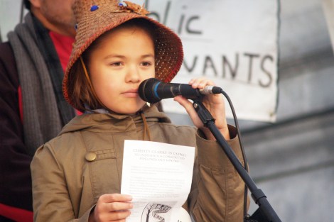 Ta'Kaiya Blaney, 10, of Sleiamun Nation, addressed an anti-mining crowd of several hundred. Photo by David P. Ball.