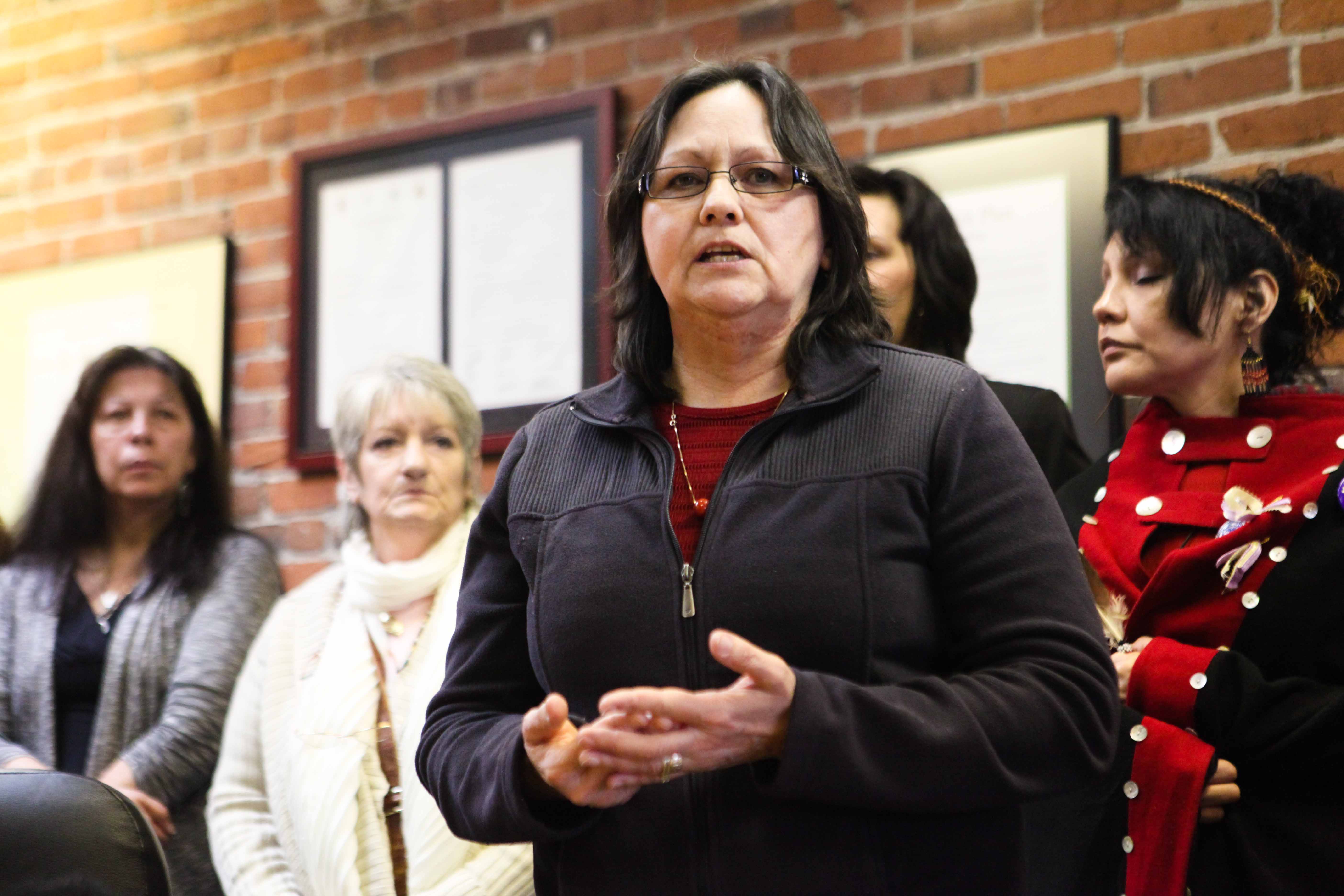 Marlene George, with the Women's Memorial March Committee, addresses a April 10 press conference. Photo by David P. Ball