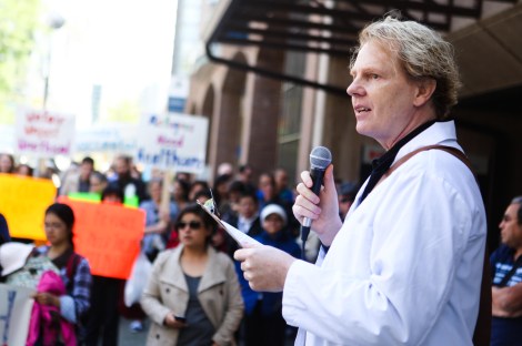 Yesterday health providers across the country rallied in 14 cities, including roughly 250 attending a demonstration in Vancouver outside Citizenship and Immigration Canada (CIC) offices on Hornby St. — many in turquoise hospital scrubs, white physician lab coats and stethoscopes.