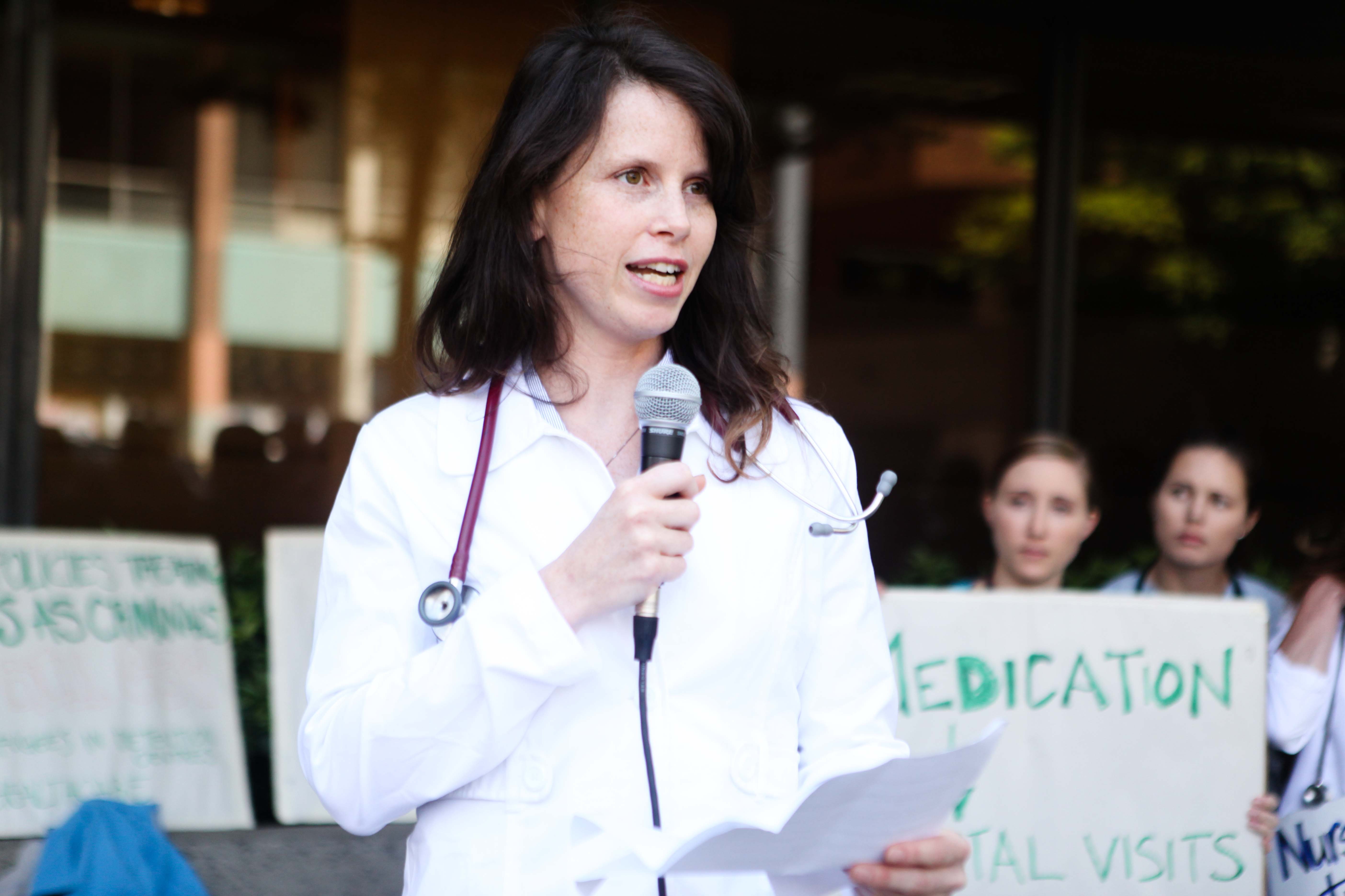 Some of the health workers who addressed the crowd were themselves refugees, and decried cuts to refugee health services which come into effect on Canada Day, which they said would lead to preventable deaths and illnesses.