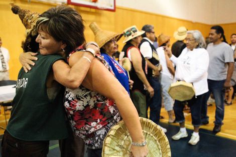 Following the class action lawsuit’s filing in federal court Wednesday, residential school survivors and tribal, provincial and national leaders hugged one another and vowed to stand together. Photo by David P. Ball.