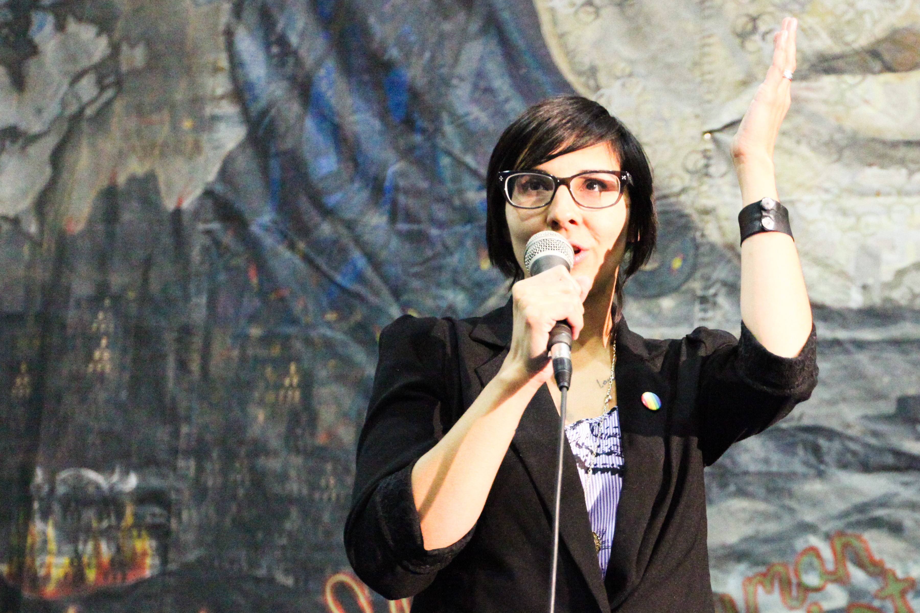 Athabasca Chipewyan First Nation spokesperson Eriel Deranger speaks out against the oilsands at a recent event in Vancouver. Photo by David P. Ball