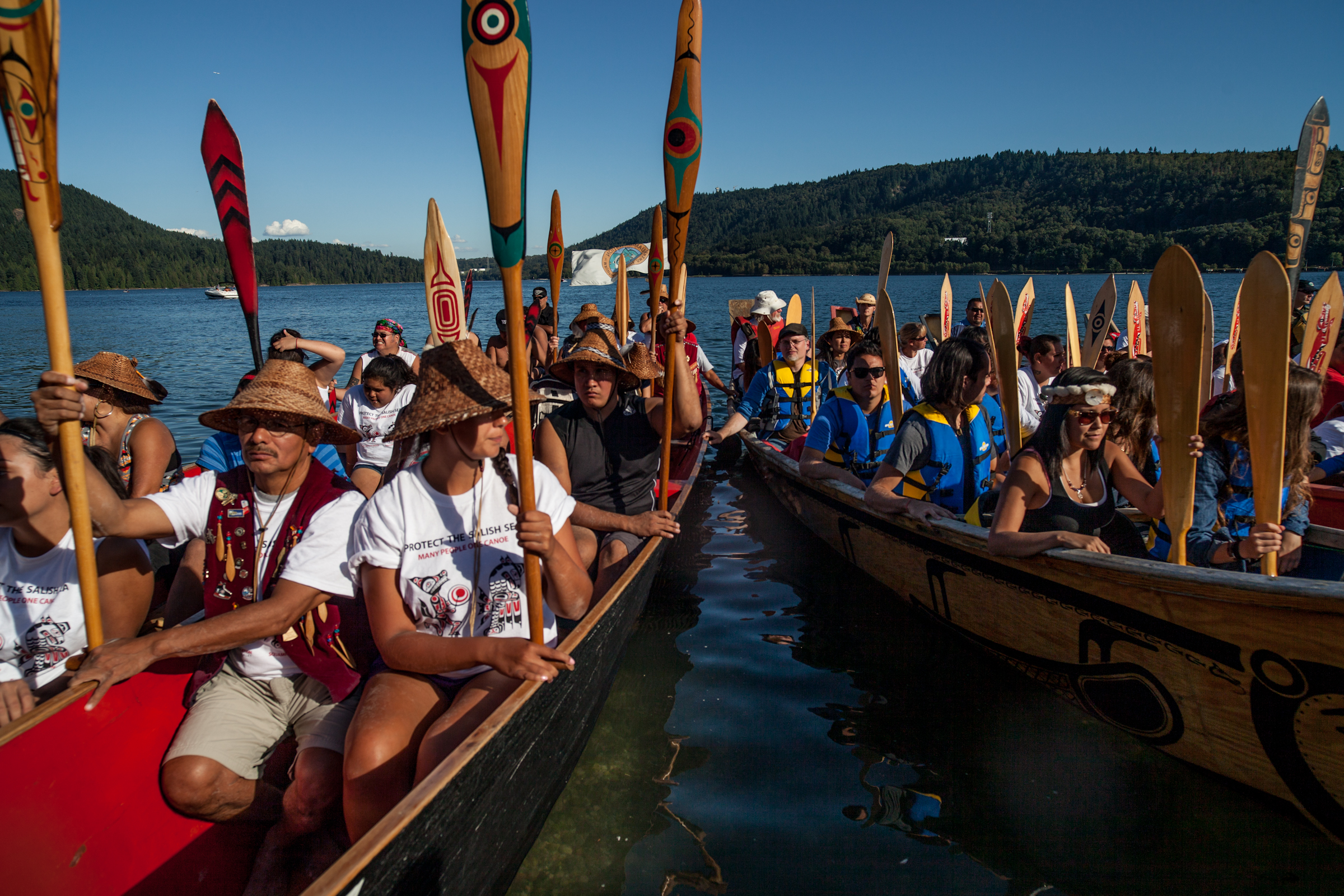 Paddlers from Squamish and Tsleil-Waututh nations journey between their territories in opposition to the Kinder Morgan pipeline expansion. Photo by Zack Embree
