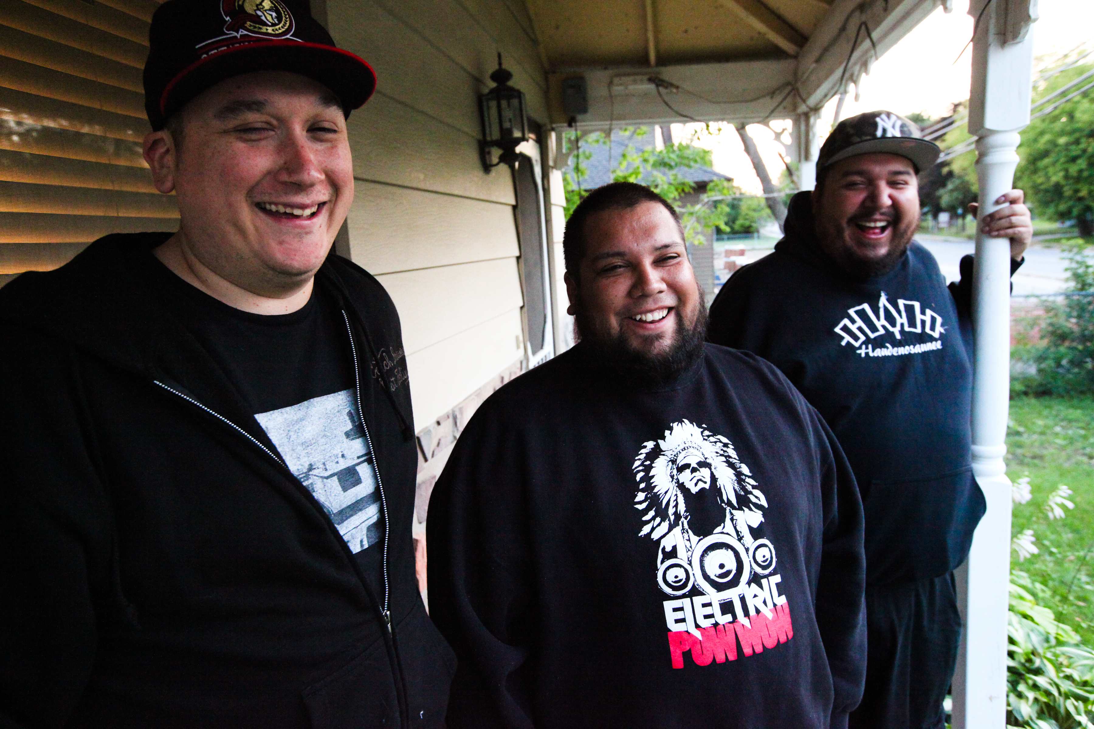 Members of A Tribe Called Red on DJ Shub (Dan General)’s porch near Ottawa: from left, Ian Campeau, Bear Thomas, Dan General