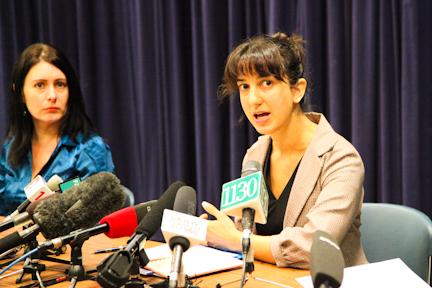 Kasari Govender (right), executive director of West Coast LEAF, speaks at a press conference for the release of the “Blueprint for an Inquiry” report Nov. 19, with Darcie Bennett of Pivot Legal Society (left). Photo by David P. Ball.