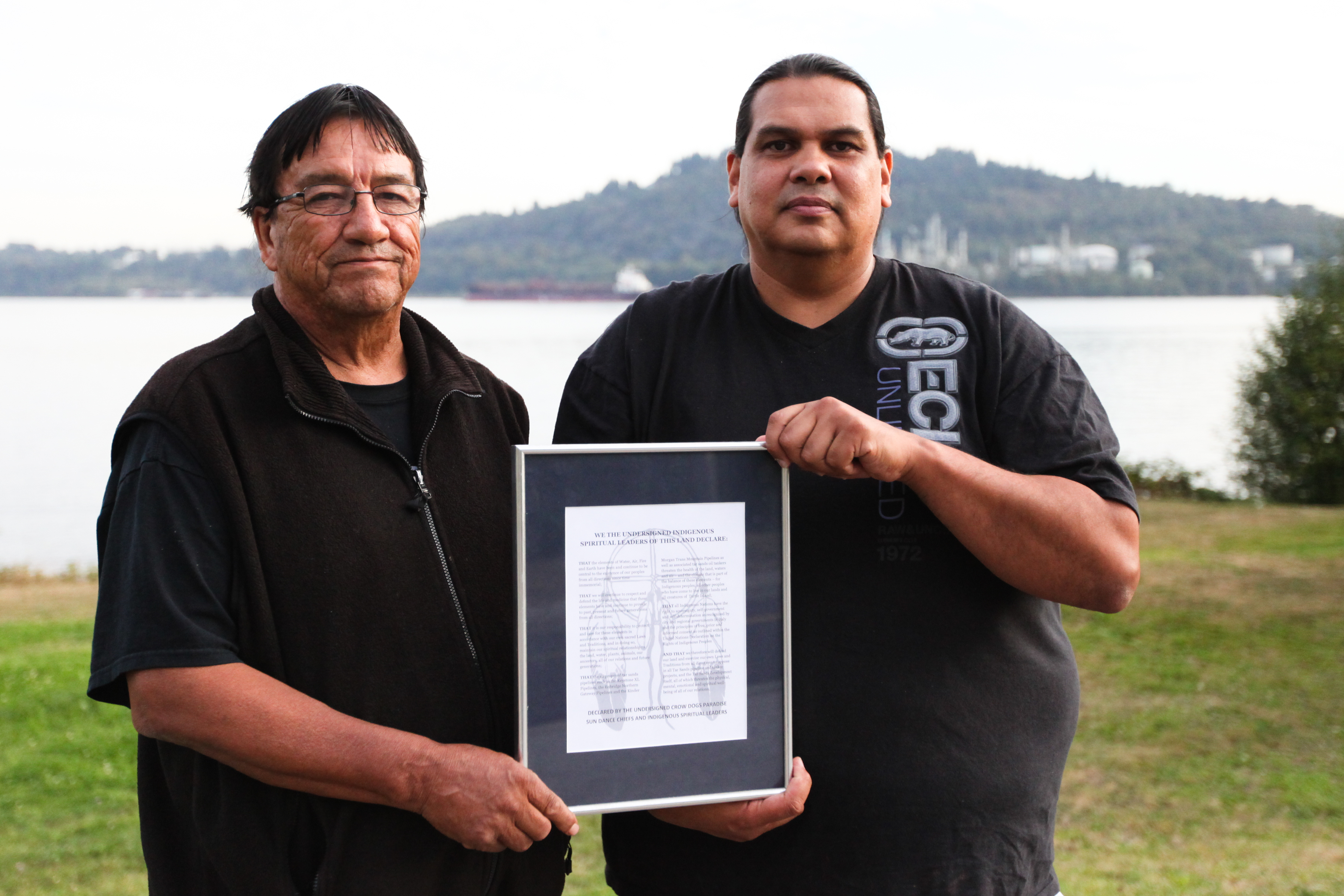 Sundance Chiefs Charles Scribe (left) and Rueben George, of Cree and Tsleil Waututh nations respectively, hold the anti-oil sands declaration. In the background, a tanker passes through the Burrard Inlet near an oil refinery. Photo by David P. Ball