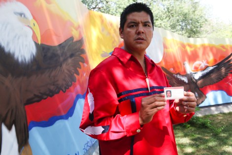 Richard Peters shows is well-worn Indian Status card in front of an Anishinabe mural in Toronto, Ontario. Photo by David P. Ball