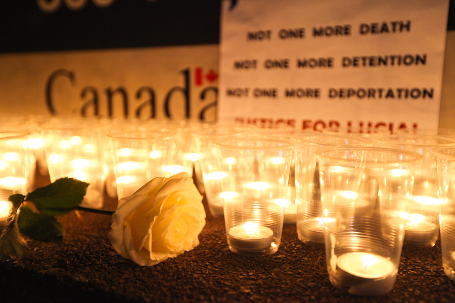 Migrant advocates hold a candlelight vigil outside the Canada Border Services Agency’s Vancouver offices. Photo by David P. Ball
